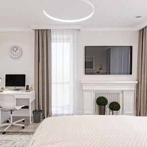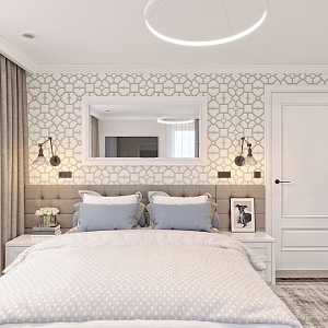 Интерьер спальни с подсветкой настенной, подсветкой светодиодной, рейками с подсветкой, с подсветкой, с рабочим местом, светильниками над кроватью и световыми линиями, проект «ПУДРОВЫЙ ЛЕС» №3