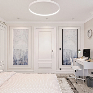 Интерьер спальни cветовыми линиями, рейками с подсветкой, подсветкой настенной, подсветкой светодиодной, светильниками над кроватью и с подсветкой, проект «ПУДРОВЫЙ ЛЕС» №11