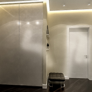 Интерьер коридора с подсветкой настенной, подсветкой светодиодной, порогом, проходной, рейками с подсветкой, с подсветкой и световыми линиями в современном стиле, проект «Мужской интерьер холостяка» №10
