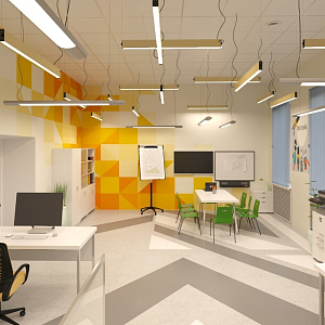 Интерьер офиса cветовыми линиями, рейками с подсветкой, подсветкой настенной, подсветкой светодиодной и подсветкой рабочей зоны в современном стиле, проект «Офис в современном стиле» №4