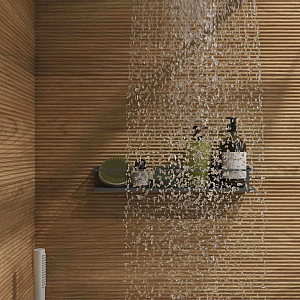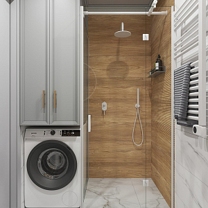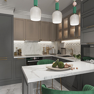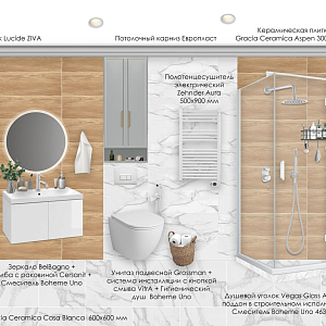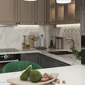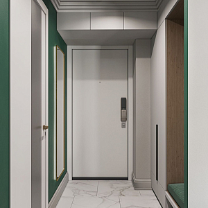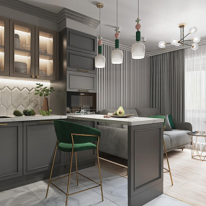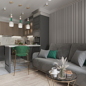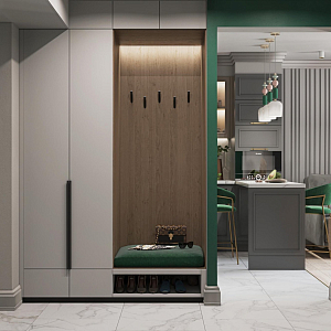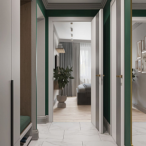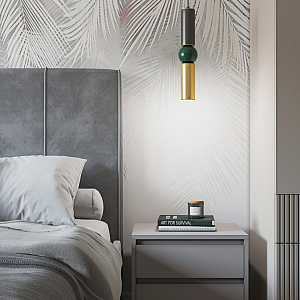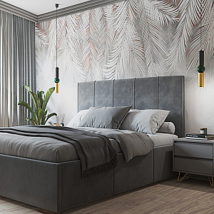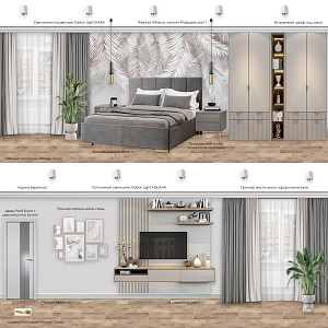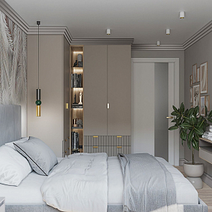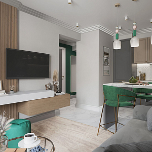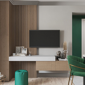 Интерьер спальни с панно за телевизором, стеной с телевизором, телевизором на стене, нишей для телевизора и керамогранитом на стену с телевизором в современном стиле, проект «Квартира 40 м2 для супружеской пары в нейтральных цветах с яркими зелеными акцен №19