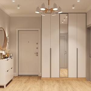 Интерьер с вертикальными жалюзи, зонированием, зонированием рейками, рейками с подсветкой и телевизором на рейках в стиле лофт и в современном стиле, проект «3-х комнатная квартира для молодой семьи с ребенком в современном стиле в ЖК "Светлоград"» №4