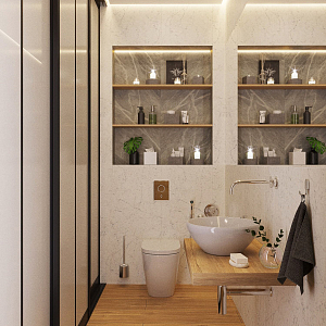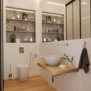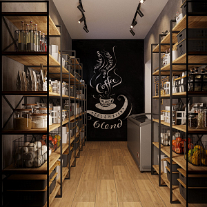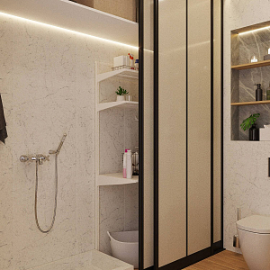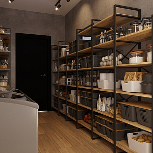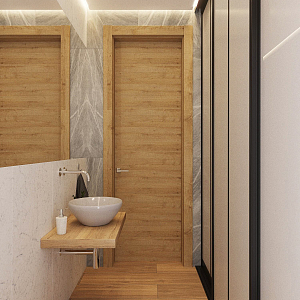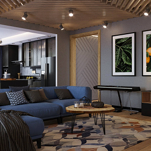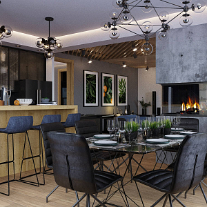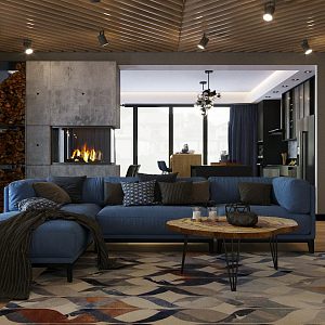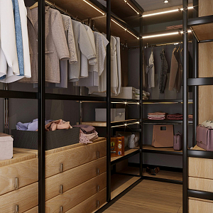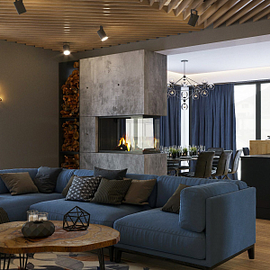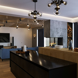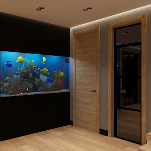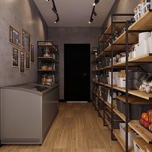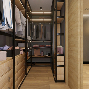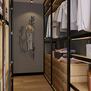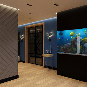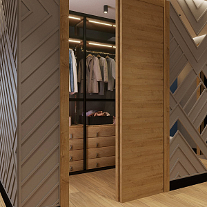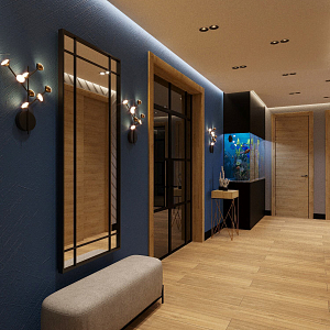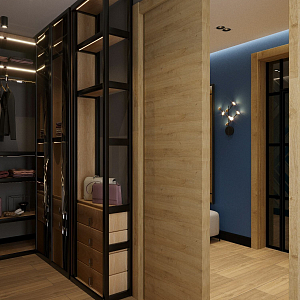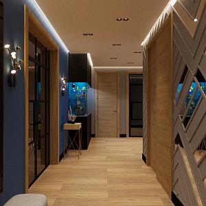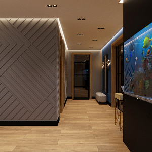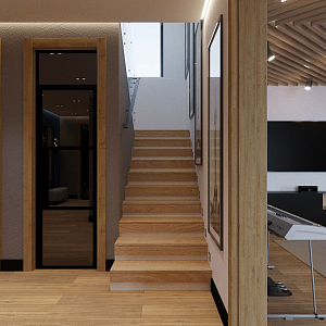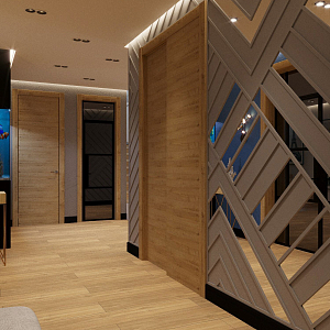Интерьер коридора cветовыми линиями, рейками с подсветкой, подсветкой настенной, подсветкой светодиодной и с подсветкой в стиле лофт, проект «1-й этаж загородного дома для молодой семьи из 4-х человек в стиле лофт» №7