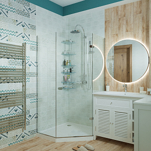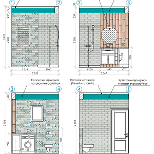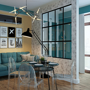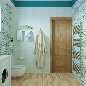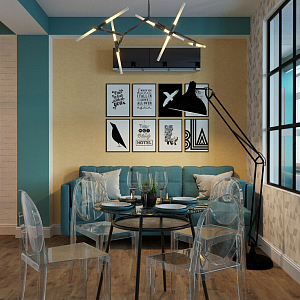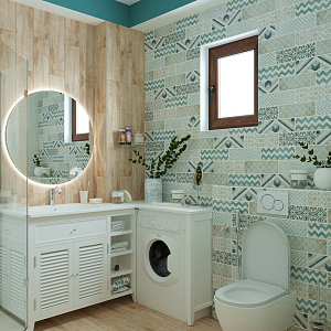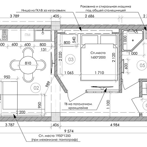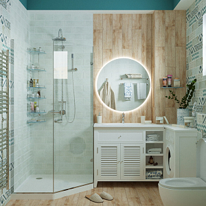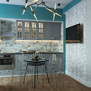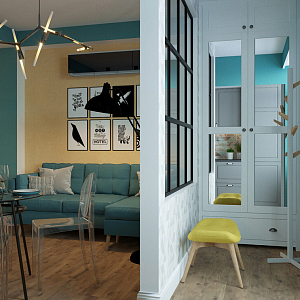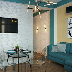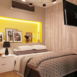 Интерьер спальни с нишей с подсветкой, световыми линиями, рейками с подсветкой, подсветкой настенной, подсветкой светодиодной, светильниками над кроватью, подсветкой рабочей зоны и с подсветкой, проект «Квартира в бирюзовых тонах в Сочи» №9