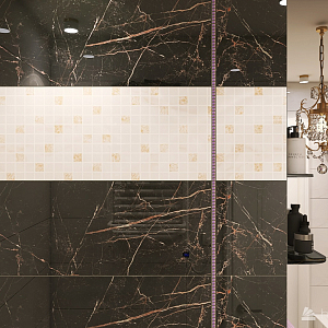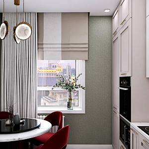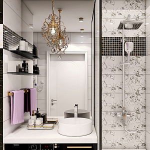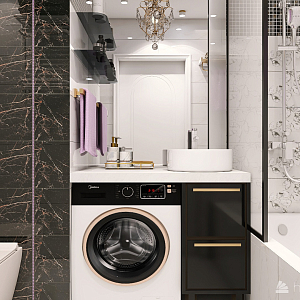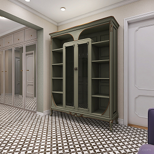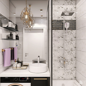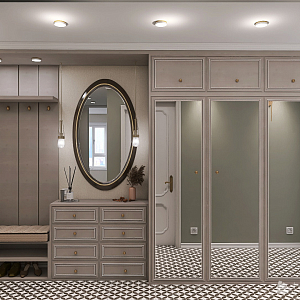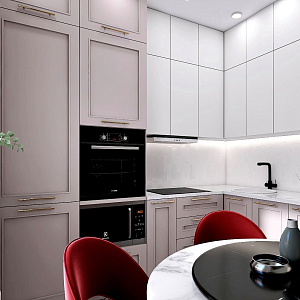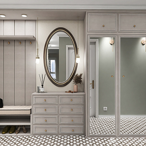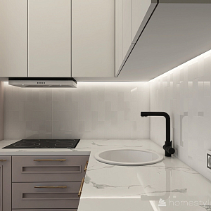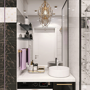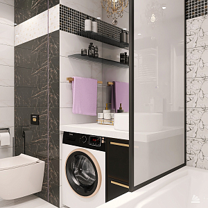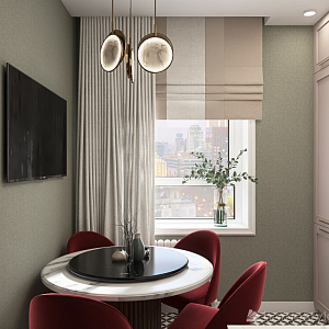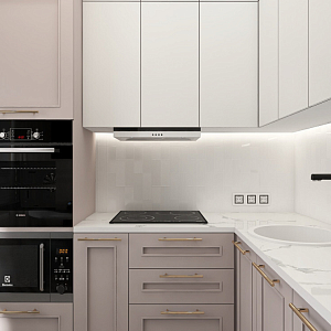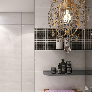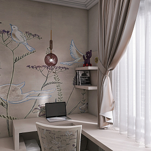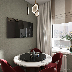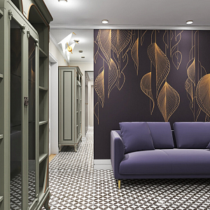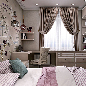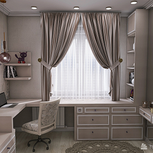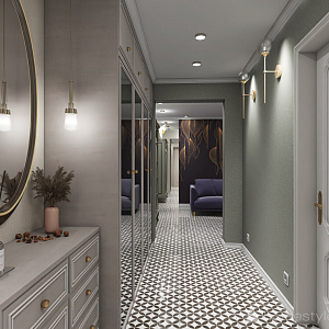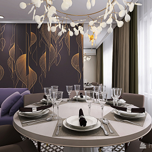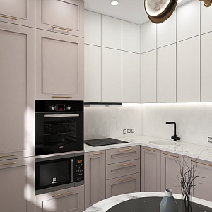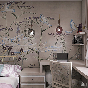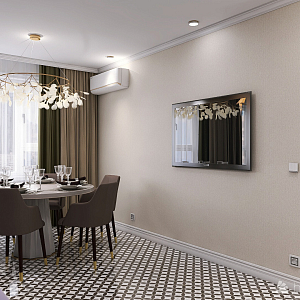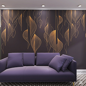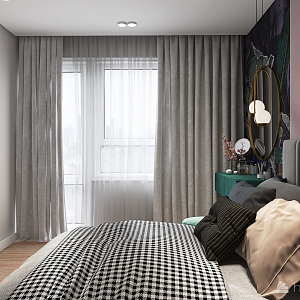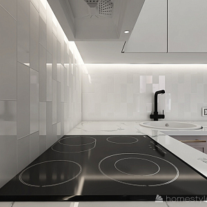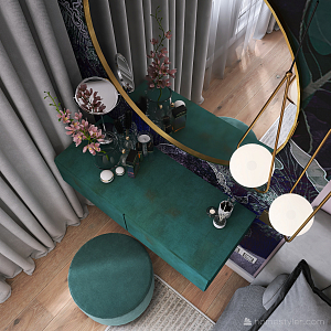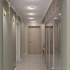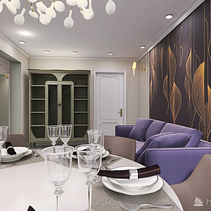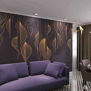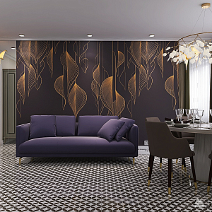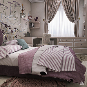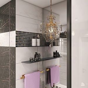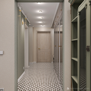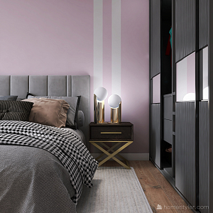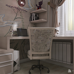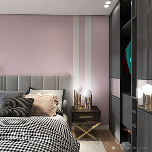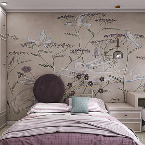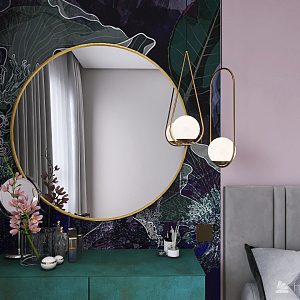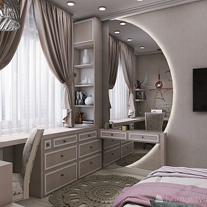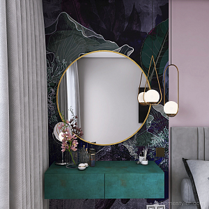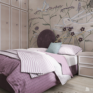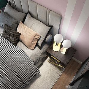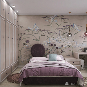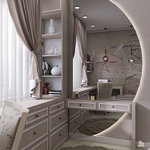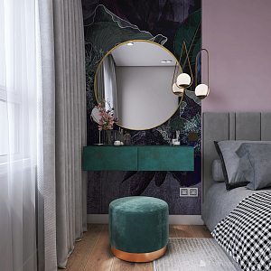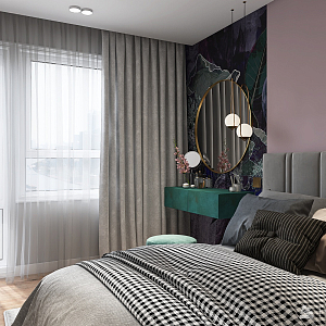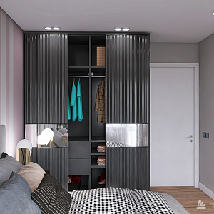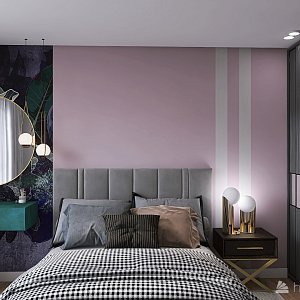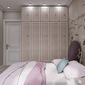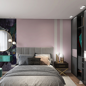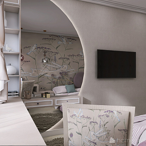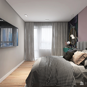 Интерьер спальни с панно за телевизором, стеной с телевизором, телевизором на стене, керамогранитом на стену с телевизором и подсветкой настенной, проект «Проект в Нефтюганске» №21