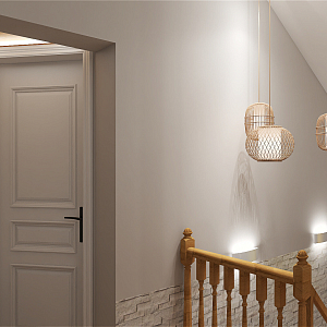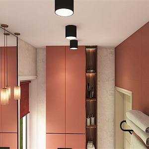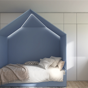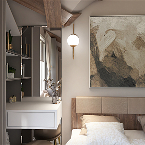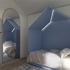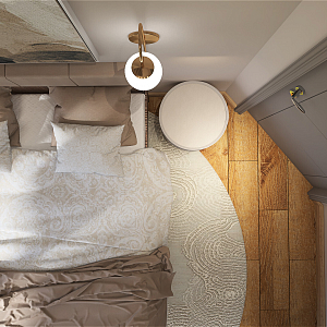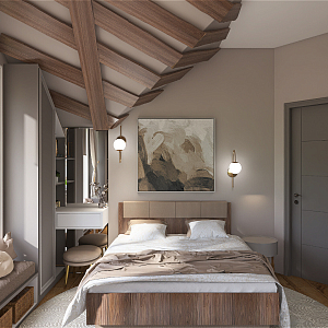 Интерьер спальни с нишей с подсветкой, световыми линиями, рейками с подсветкой, подсветкой настенной, подсветкой светодиодной, светильниками над кроватью и с подсветкой, проект «Суходолье» №13
