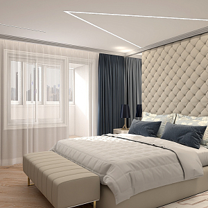 Интерьер спальни с подсветкой настенной, подсветкой светодиодной, рейками с подсветкой, с подсветкой, светильниками над кроватью и световыми линиями в неоклассике, проект «Тобольск 7 мкр» №71