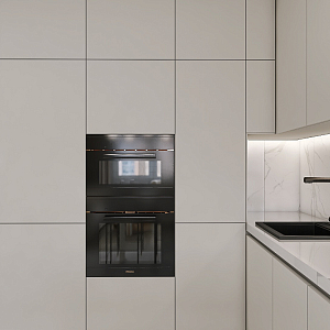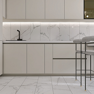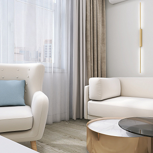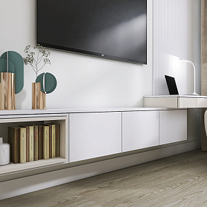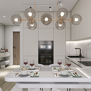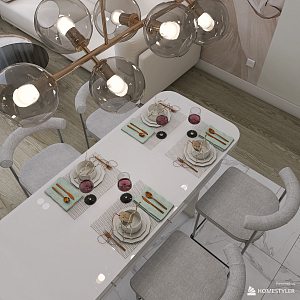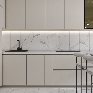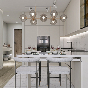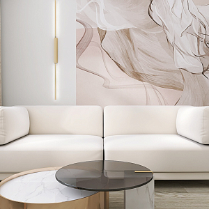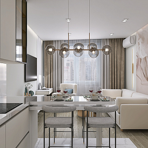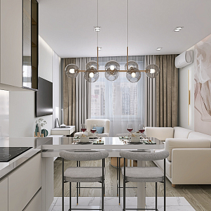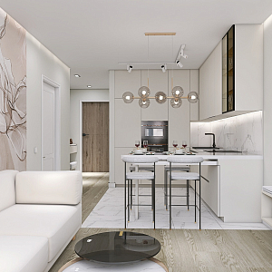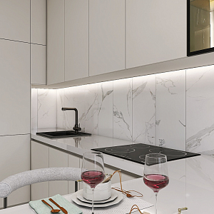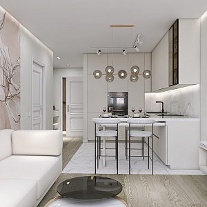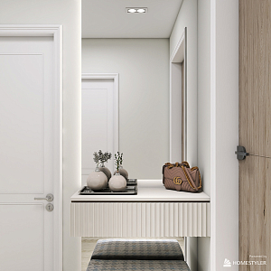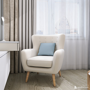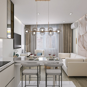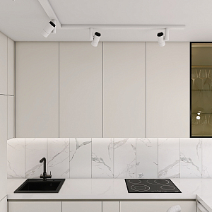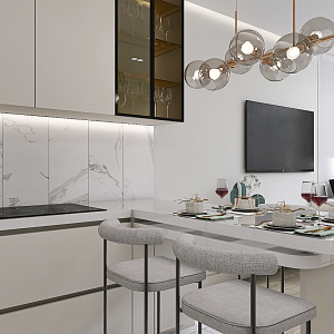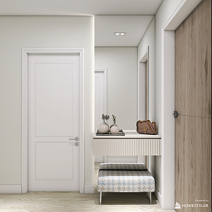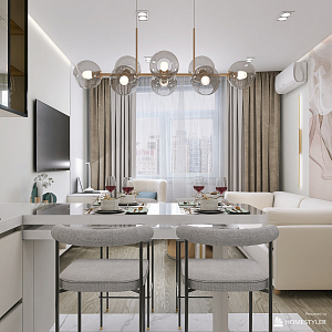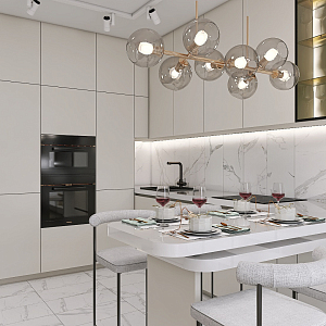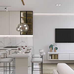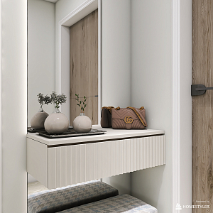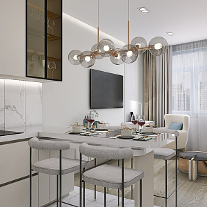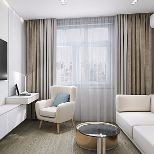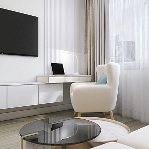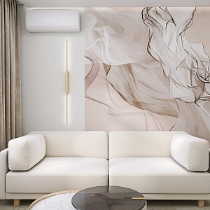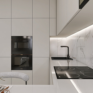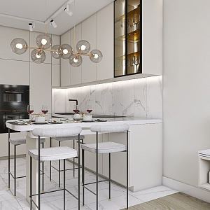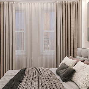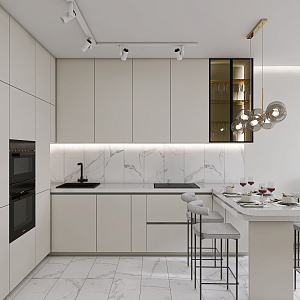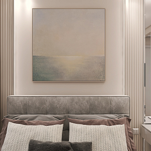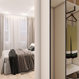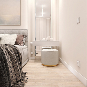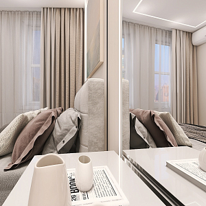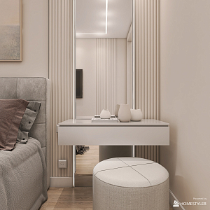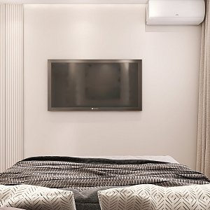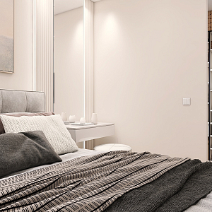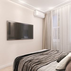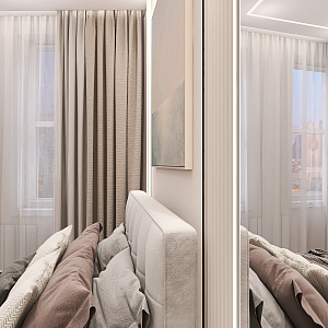 Интерьер спальни с нишей с подсветкой, подсветкой настенной, подсветкой светодиодной, порогом, рейками с подсветкой, с подсветкой, светильниками над кроватью и световыми линиями в современном стиле, проект «Европейский берег» №7
