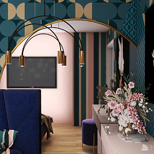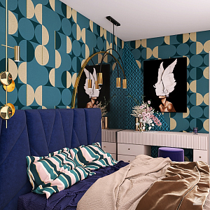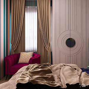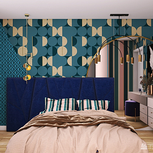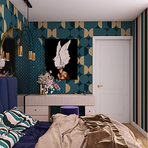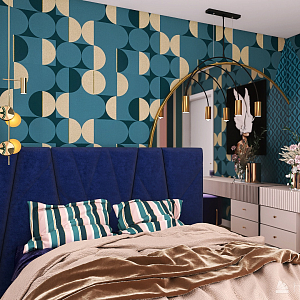 Интерьер спальни с панно за телевизором, стеной с телевизором, телевизором на стене, нишей для телевизора и керамогранитом на стену с телевизором в современном стиле, проект «Дизайн-квартал МОЕ» №20