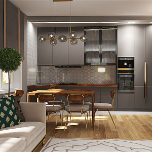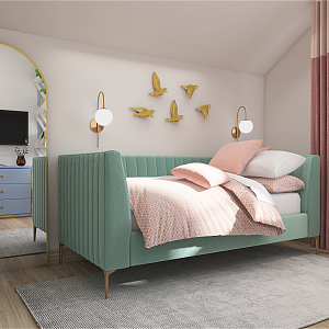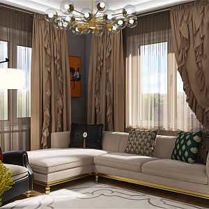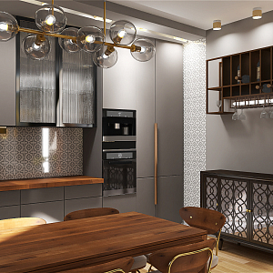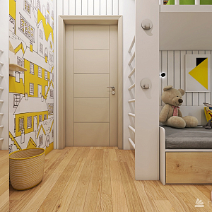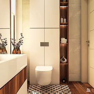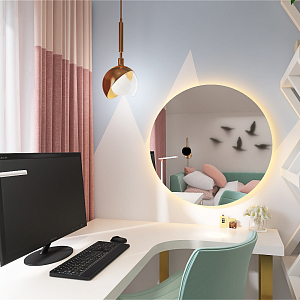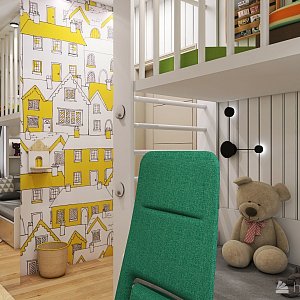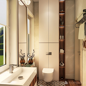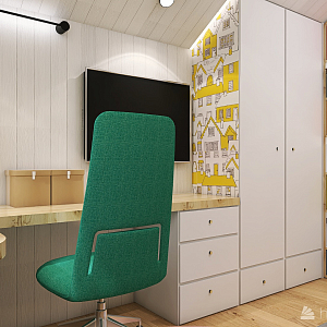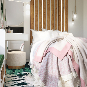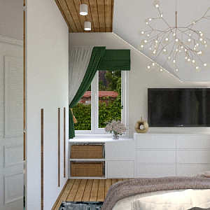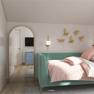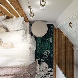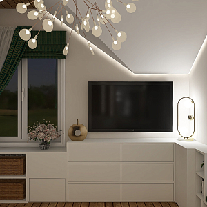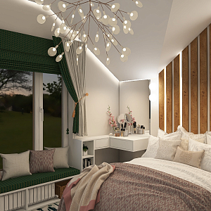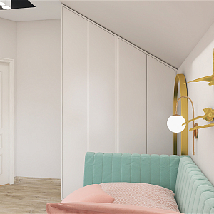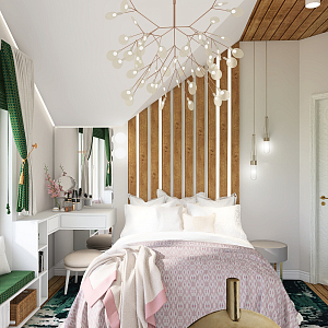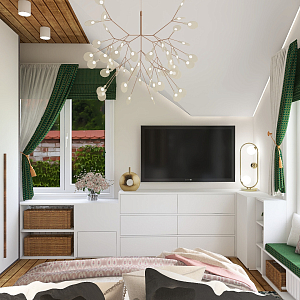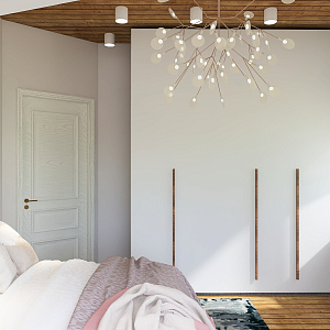 Интерьер спальни с бра над кроватью, панно за телевизором, подсветкой настенной, подсветкой светодиодной, рейками с подсветкой и светильниками над кроватью, проект «Патрушева» №25