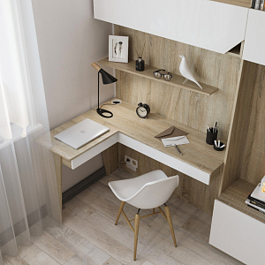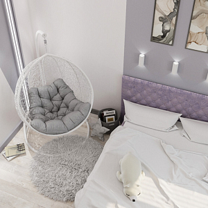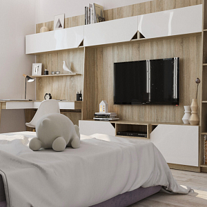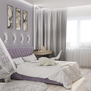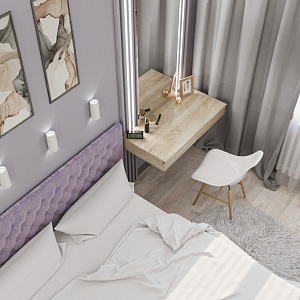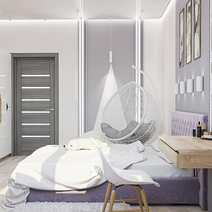 Интерьер спальни cветовыми линиями, рейками с подсветкой, подсветкой настенной, подсветкой светодиодной и с подсветкой в современном стиле, проект «Проект "Зефир" (комната подростка)» №1