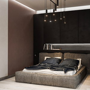 Интерьер спальни с кроватью в нише, бра над кроватью и светильниками над кроватью в современном стиле и в стиле лофт, проект «Проект "Зефир" (Мастер спальня с рабочей зоной)» №1