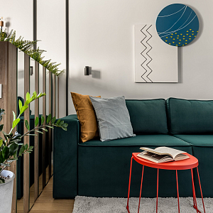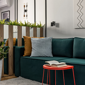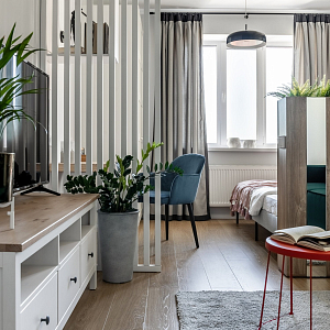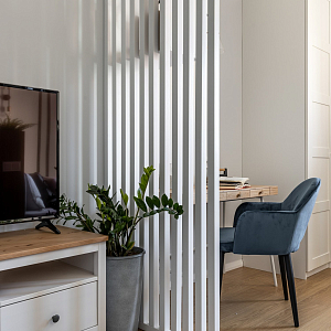 Интерьер гостиной с балконом, вертикальными жалюзи, зонированием, зонированием рейками, зонированием цветами, зонированием шторами, рейками с подсветкой и с рабочим местом в стиле лофт и в современном стиле, проект «Однушка для сдачи в аренду» №5