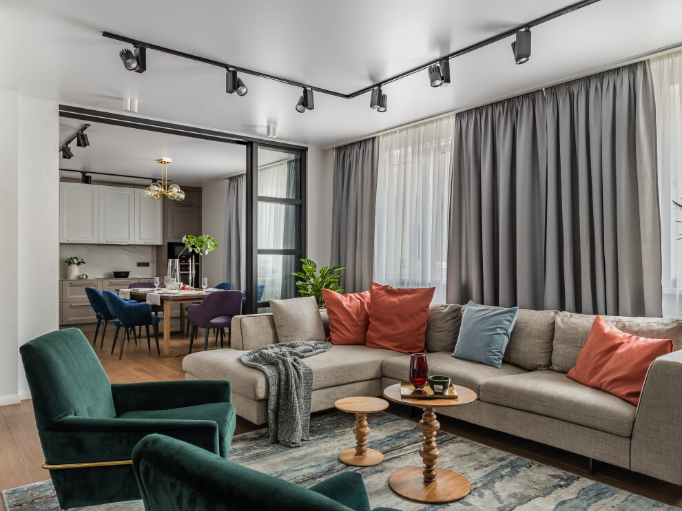 Интерьер гостиной cветовыми линиями в неоклассике, проект «Магия Цвета» №6