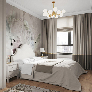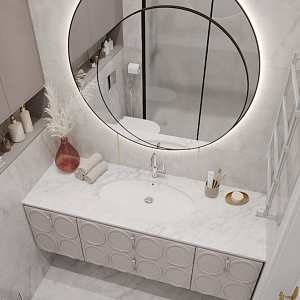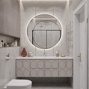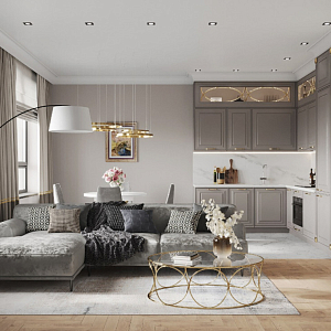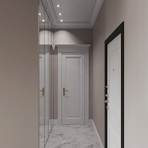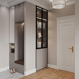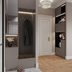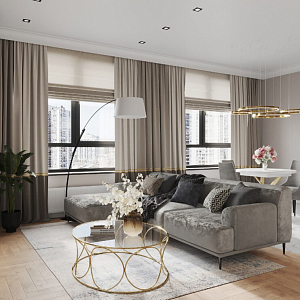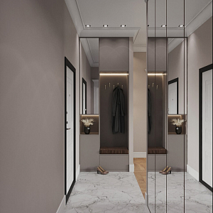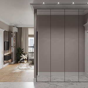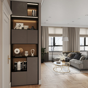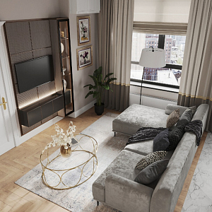 Интерьер гостиной с керамогранитом на стену с телевизором, нишей для телевизора, панно за телевизором, подсветкой настенной, стеной с телевизором и телевизором на стене в современном стиле, проект «ЖК Крылья» №26