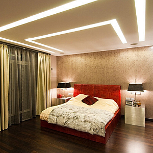 Интерьер спальни с нишей с подсветкой, подсветкой настенной, подсветкой светодиодной, рейками с подсветкой, с подсветкой, светильниками над кроватью и световыми линиями, проект «Золотые ключи» №5