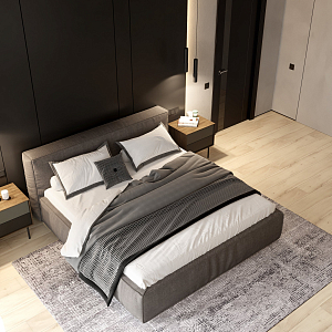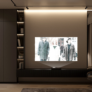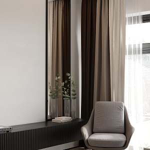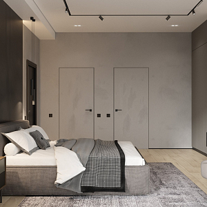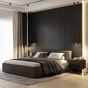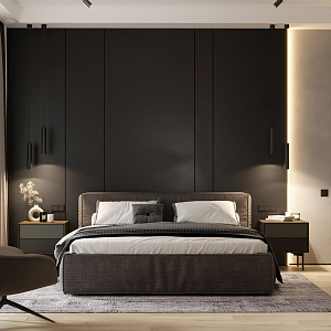 Интерьер cветовыми линиями, стеной с телевизором, керамогранитом на стену с телевизором, рейками с подсветкой, подсветкой настенной, подсветкой светодиодной и с подсветкой в современном стиле, проект «Проект спальни в загородном доме.» №7