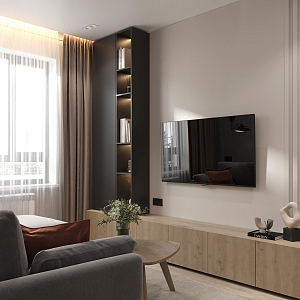Интерьер с вертикальными жалюзи, зонированием, зонированием рейками, перегородкой раздвижной, рейками с подсветкой, стеной с телевизором и телевизором на рейках в стиле лофт, проект «Квартира в аренду Москва 42 кв.м., Квартира» №12