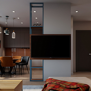 Интерьер гостиной с подсветкой настенной, подсветкой светодиодной, рейками с подсветкой, с подсветкой, светильниками над кроватью и световыми линиями в современном стиле, проект «Проект квартиры в ЖК "Скандинавия"» №10
