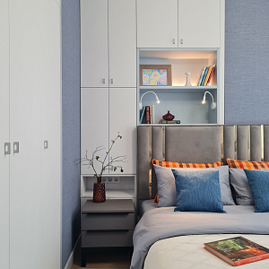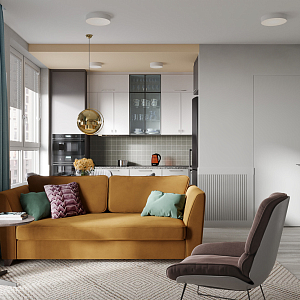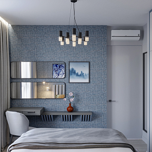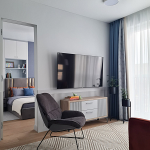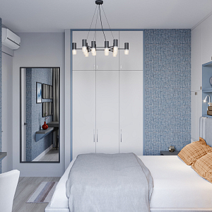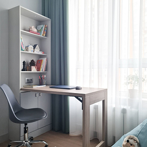 Интерьер c рабочим местом, световыми линиями, рейками с подсветкой, подсветкой настенной и подсветкой светодиодной в современном стиле, проект «Квартира в ЖК "Лефортово" (реализация и визуализация)» №10