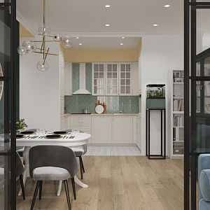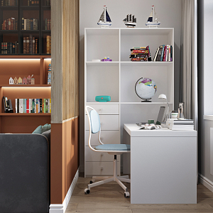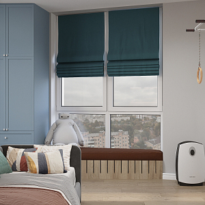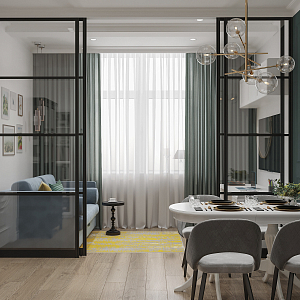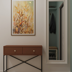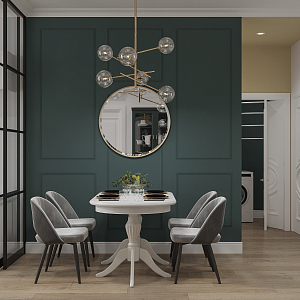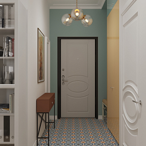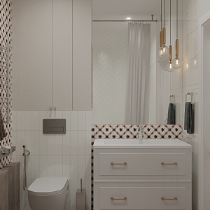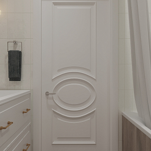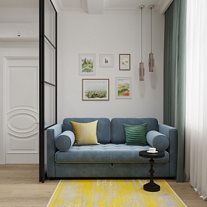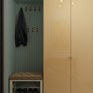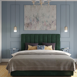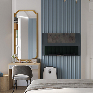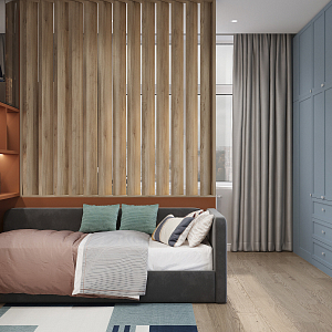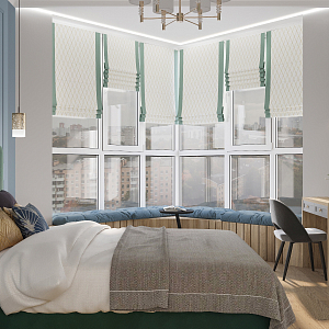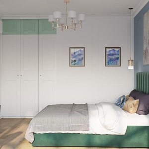 Интерьер спальни с кроватью в нише, кроватью между шкафами, кроватью у двери, с антресолью, шкафом над кроватью и шкафом у кровати в стиле лофт и неоклассике, проект «Квартира в ЖК Флотилия» №2