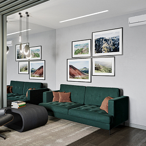 Интерьер гостиной cветовыми линиями, рейками с подсветкой, подсветкой настенной и подсветкой светодиодной в современном стиле, проект «Офис руководства в гостинице (реализация и визуализация)» №21