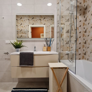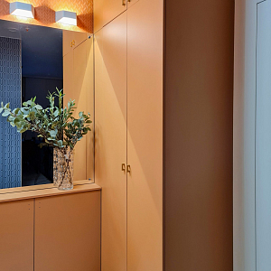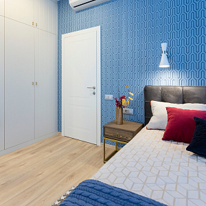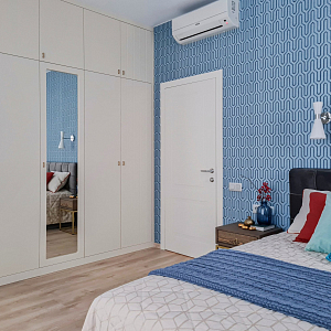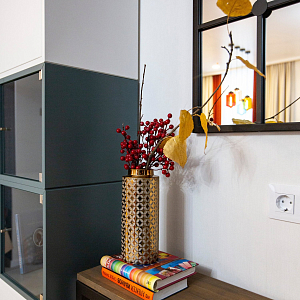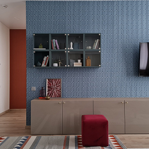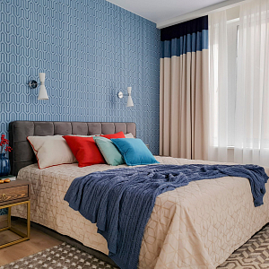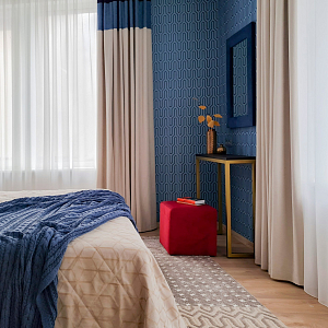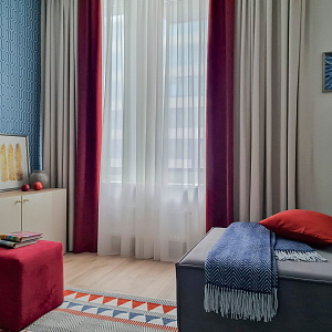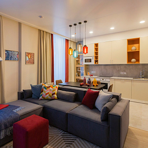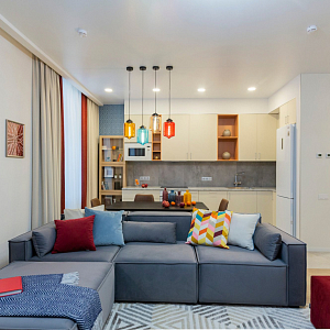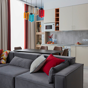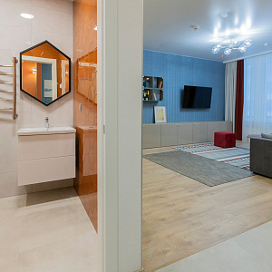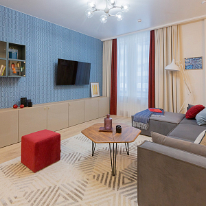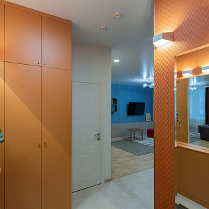 Интерьер гостиной cветовыми линиями, подсветкой настенной, подсветкой светодиодной и с подсветкой в современном стиле, проект «Квартира в апарт-отеле в современном стиле» №13