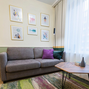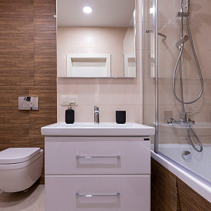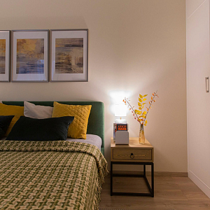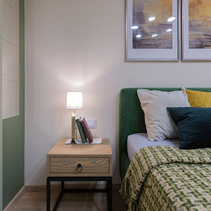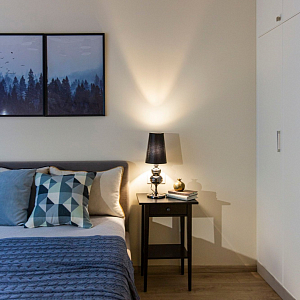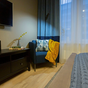 Интерьер спальни cветовыми линиями, подсветкой настенной и подсветкой светодиодной в современном стиле, проект «Квартира с двумя спальнями в апарт-отеле (реализация)» №17
