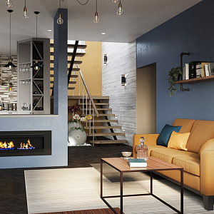 Интерьер гостиной с жалюзи и дверными жалюзи в стиле лофт, проект «Общая зона в доме г. Королев» №1