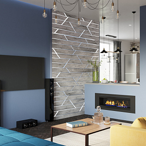 Интерьер гостиной с подсветкой настенной и подсветкой светодиодной в стиле лофт, проект «Общая зона в доме г. Королев» №5