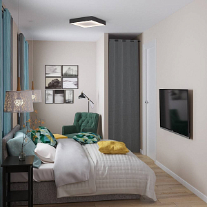 Интерьер спальни cветовыми линиями, рейками с подсветкой, подсветкой настенной и подсветкой светодиодной в скандинавском стиле, проект «Дуплекс в ЖК "Федоскино" эскизы на согласование» №9
