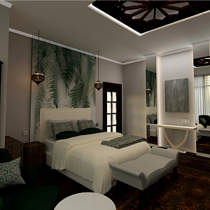 Интерьер спальни cветовыми линиями, рейками с подсветкой, подсветкой настенной, подсветкой светодиодной и с подсветкой в восточном стиле, проект «Мастер спальня в КП Новорижский» №1