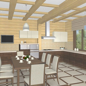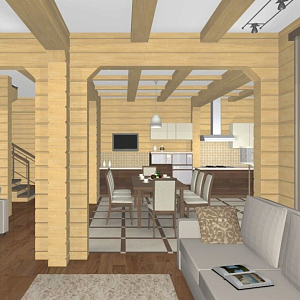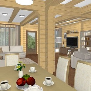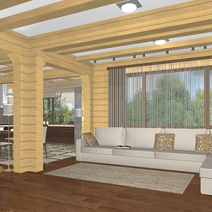 Интерьер гостиной с в деревянном доме и сауной в скандинавском стиле, проект «Интерьер деревянного дома (брус)» №4