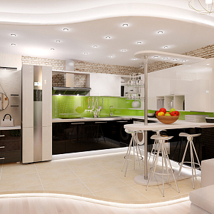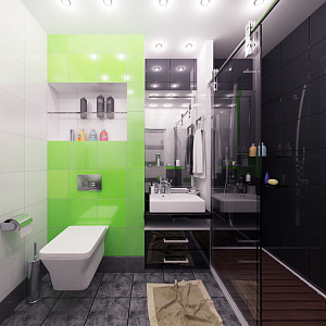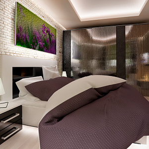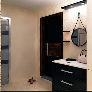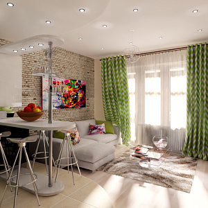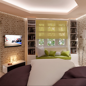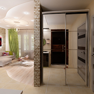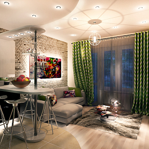 Интерьер с зонированием, зонированием цветами, зонированием шторами, перегородкой, перегородкой раздвижной и проходной в стиле лофт и в современном стиле, проект «Квартира-студия для молодой пары» №8