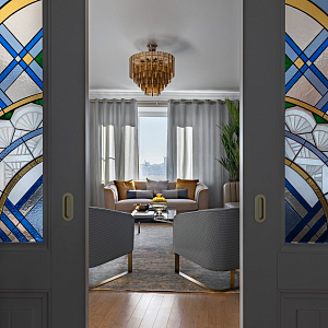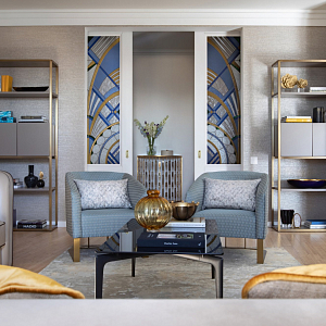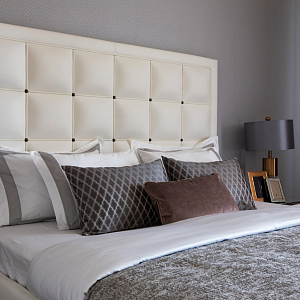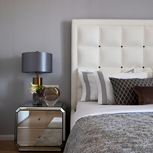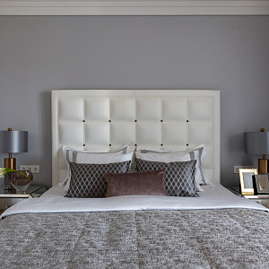 Интерьер спальни с бра над кроватью, подсветкой настенной и светильниками над кроватью в неоклассике, проект «"Самоцветы" Квартира 110 кв м» №12