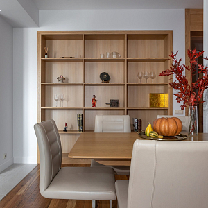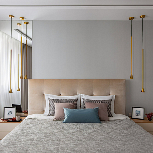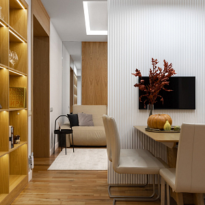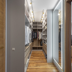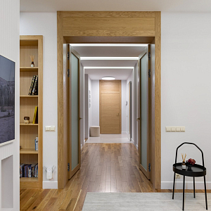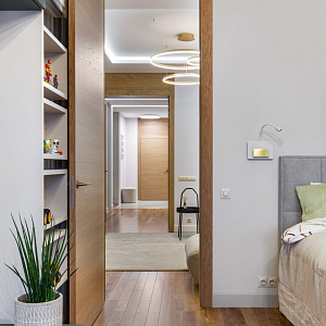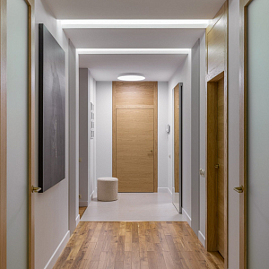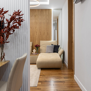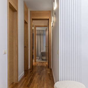 Интерьер прихожей с подсветкой настенной, подсветкой светодиодной, рейками с подсветкой, с подсветкой, светильниками над кроватью и световыми линиями в современном стиле, проект «Уютный эко-минимализм» №11