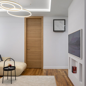 Интерьер коридора cветовыми линиями, рейками с подсветкой, подсветкой настенной, подсветкой светодиодной, светильниками над кроватью и с подсветкой в современном стиле, проект «Уютный эко-минимализм» №17