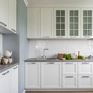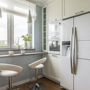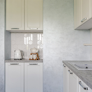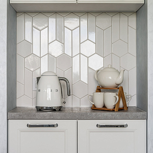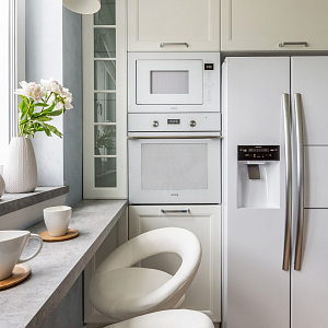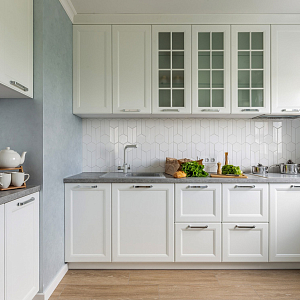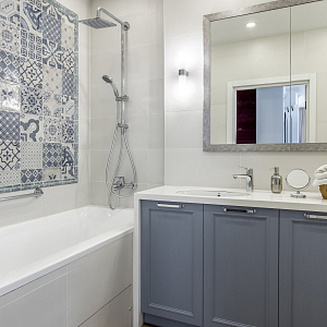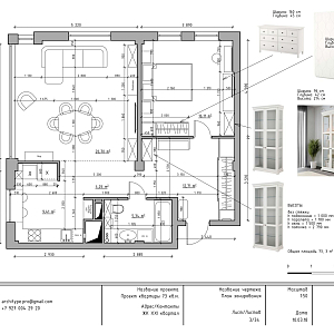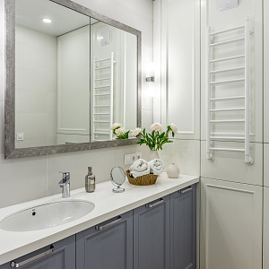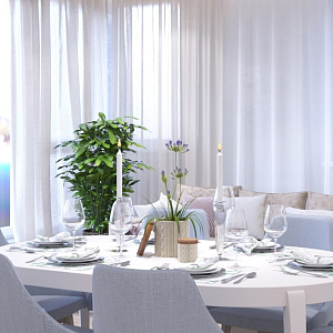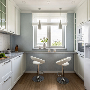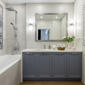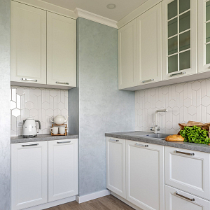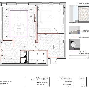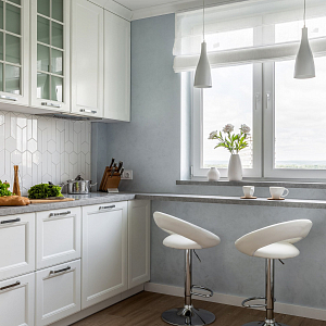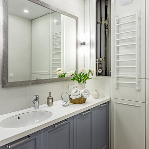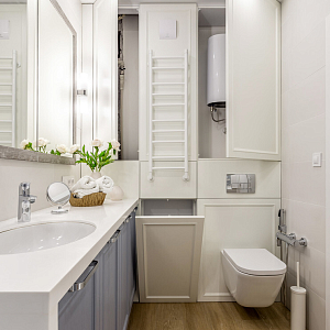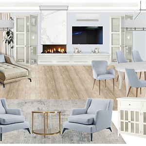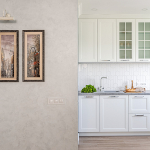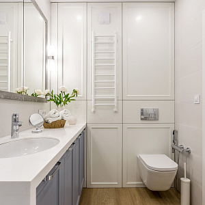 Интерьер с перегородкой, зонированием, без дверей, проходной, гостиной-прихожей, гостиной-столовой, проемом, open space и порогом в неоклассике, проект «ЖК XXI квартал» №5