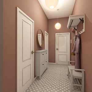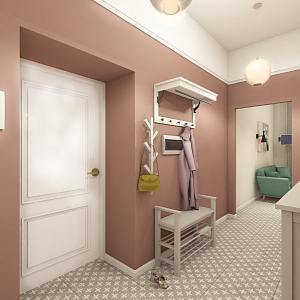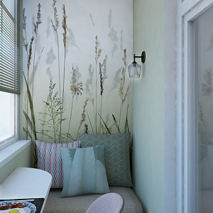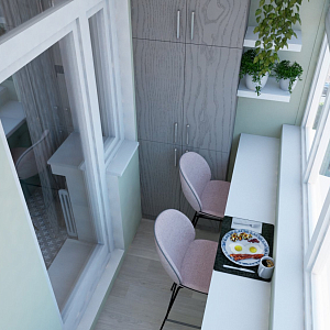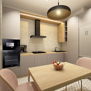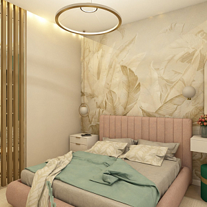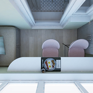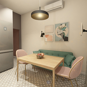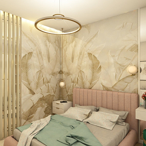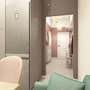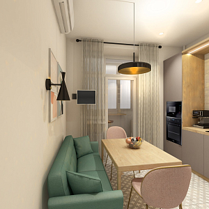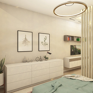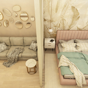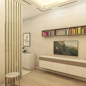 Интерьер гостиной с вертикальными жалюзи, зонированием, зонированием рейками, зонированием шторами, перегородкой, перегородкой раздвижной, рейками с подсветкой и телевизором на рейках в современном стиле, проект «Квартира для девушки.» №4