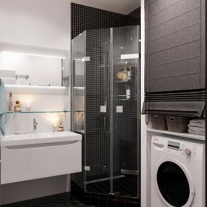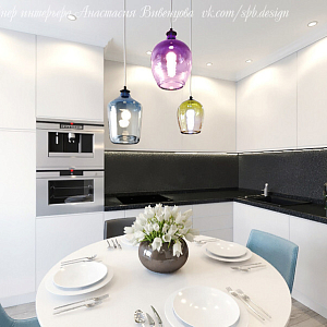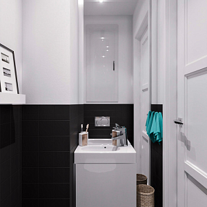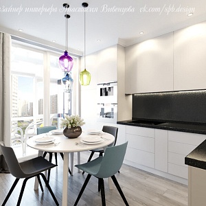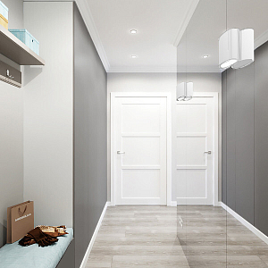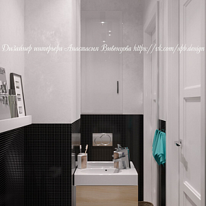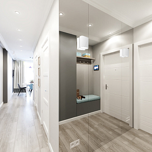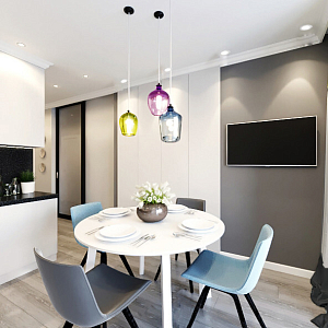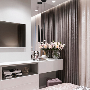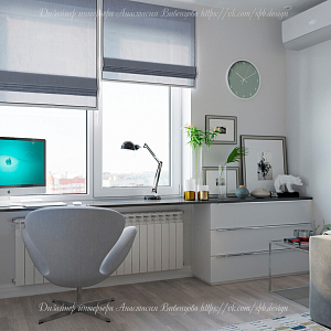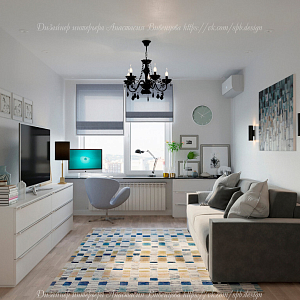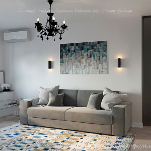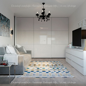 Интерьер гостиной с панно за телевизором, стеной с телевизором, телевизором на рейках, телевизором на стене и керамогранитом на стену с телевизором в скандинавском стиле, проект «Северная весна» №19
