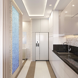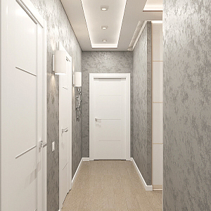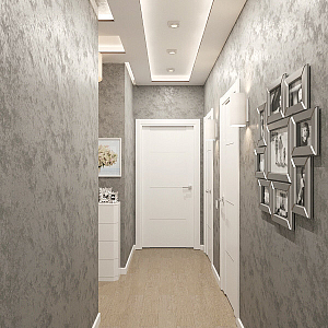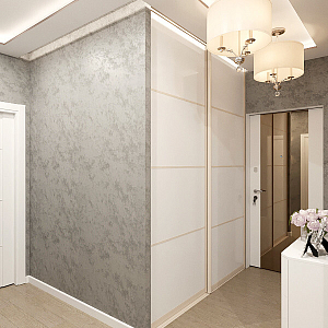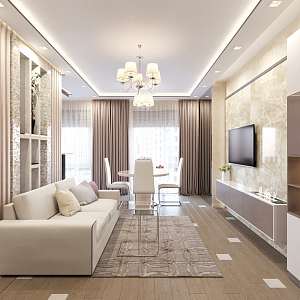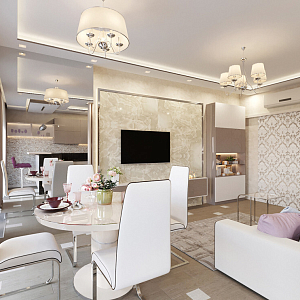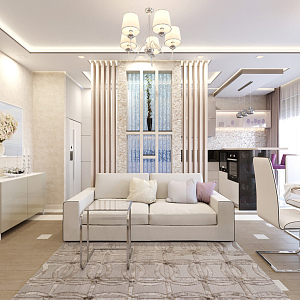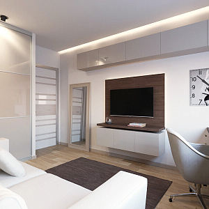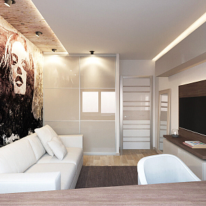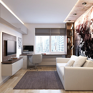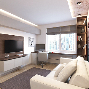 Интерьер гостиной с подсветкой настенной, подсветкой светодиодной, рейками с подсветкой и световыми линиями в современном стиле, проект «Дизайн проект квартиры в ЖК "YES"» №1