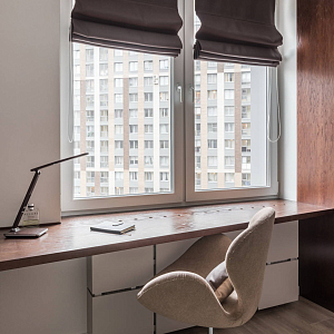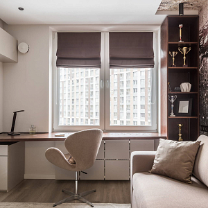 Интерьер c рабочим местом и жалюзи, проект «Реализованный проект спальни для молодого человека в Санкт-Петербурге» №1
