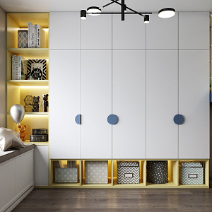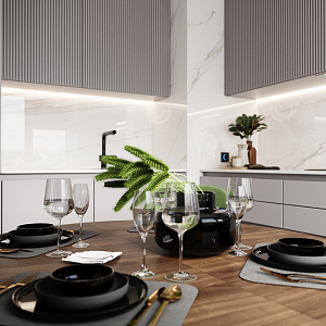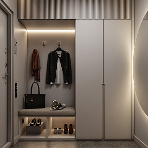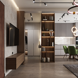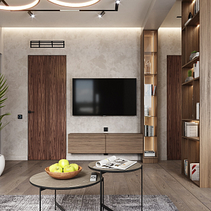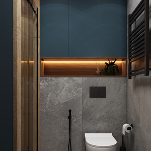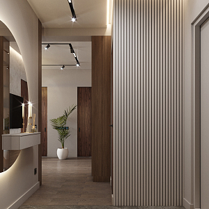 Интерьер спальни cветовыми линиями, рейками с подсветкой, бра над кроватью, подсветкой настенной, подсветкой светодиодной и светильниками над кроватью в стиле лофт, проект «Жк_Discovery» №1