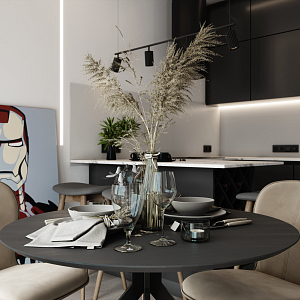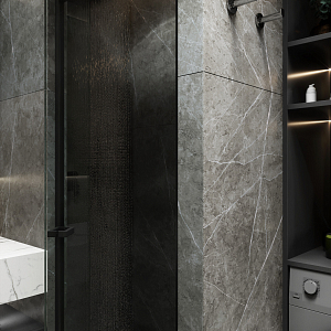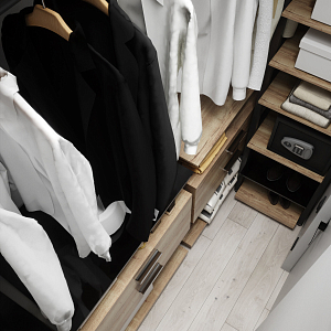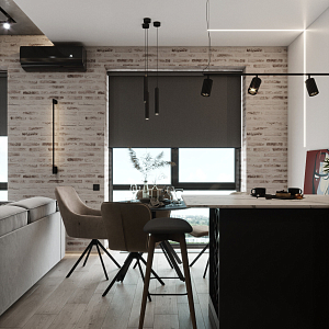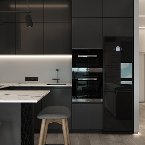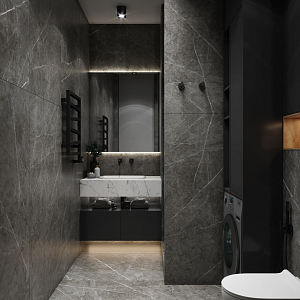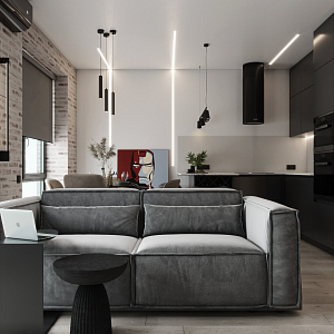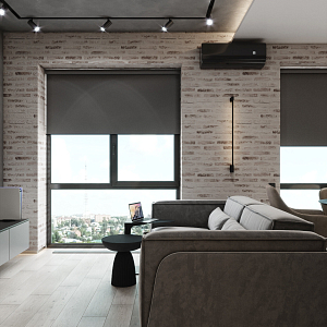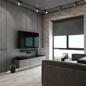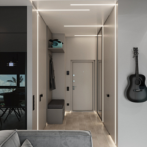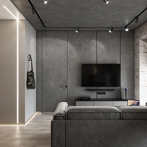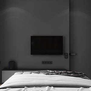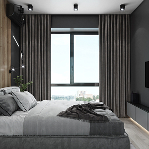 Интерьер спальни с подсветкой настенной, подсветкой светодиодной, рейками с подсветкой, с подсветкой, сауной, светильниками над кроватью и световыми линиями в стиле лофт, проект «Discovery Park» №13