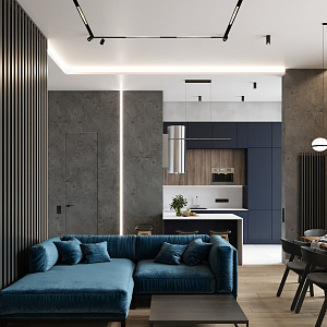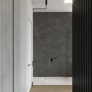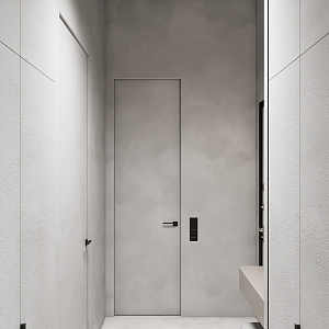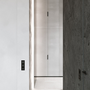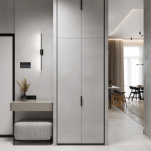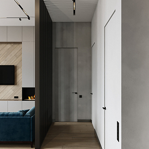 Интерьер коридора с без дверей, подсветкой настенной, подсветкой светодиодной, порогом, проходной, рейками с подсветкой и световыми линиями в современном стиле, проект «Опалиха О3» №17