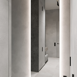 Интерьер гостиной с подсветкой настенной, подсветкой светодиодной, рейками с подсветкой, с подсветкой и световыми линиями в стиле лофт и в современном стиле, проект «Опалиха О3» №26