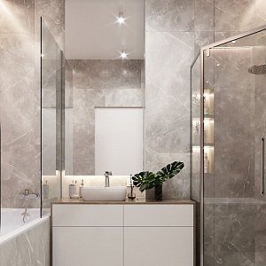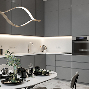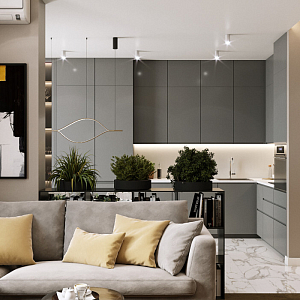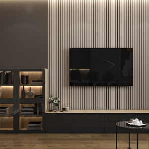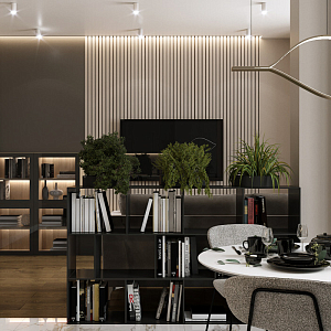 Интерьер гостиной с подсветкой настенной, подсветкой светодиодной, рейками с подсветкой, с подсветкой и световыми линиями в современном стиле, проект «Коммунарка МО» №8