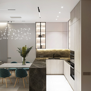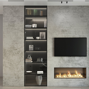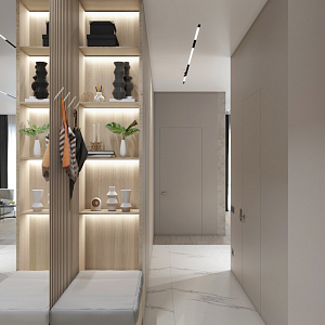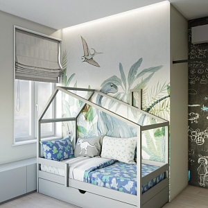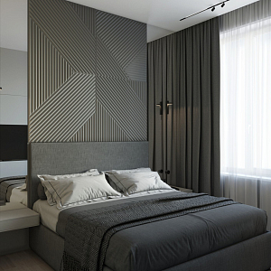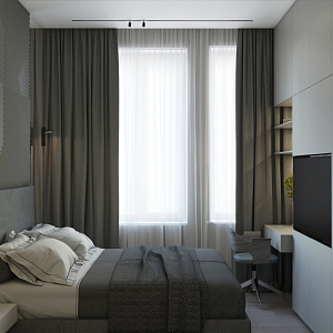Интерьер спальни с бра над кроватью, кроватью между шкафами, кроватью под потолком, кроватью у двери, подсветкой светодиодной, с антресолью, с рабочим местом, светильниками над кроватью, световыми линиями, шкафом над кроватью, шкафом напротив кровати и шк №16