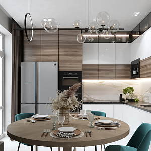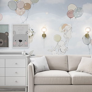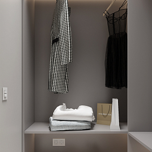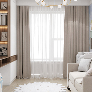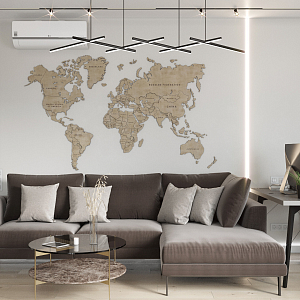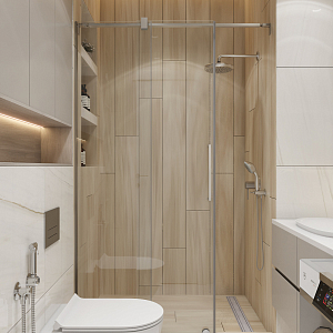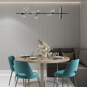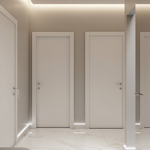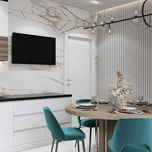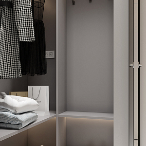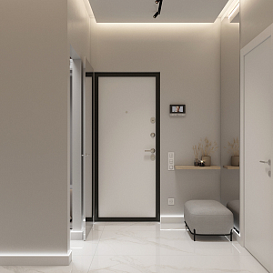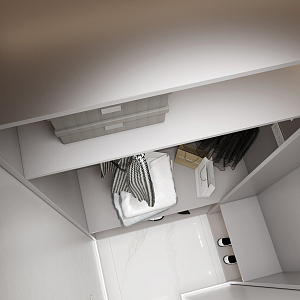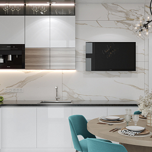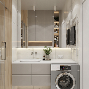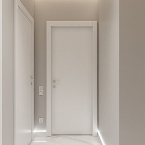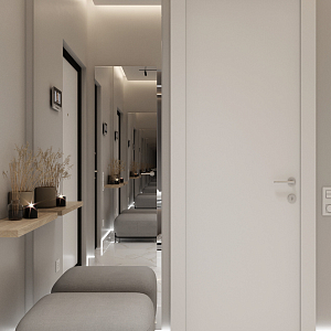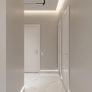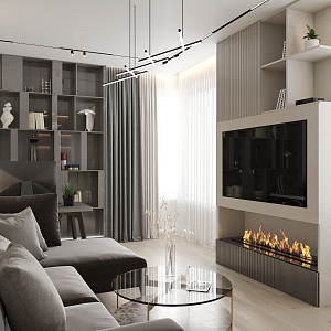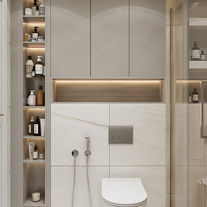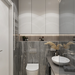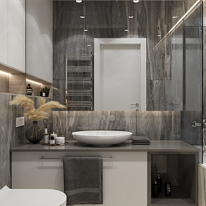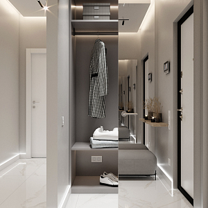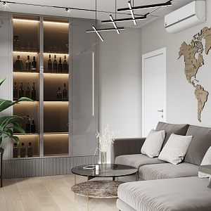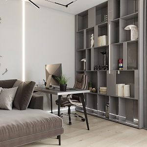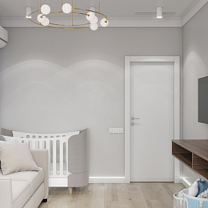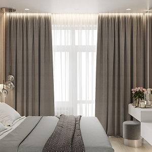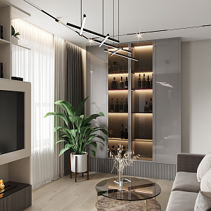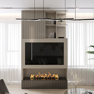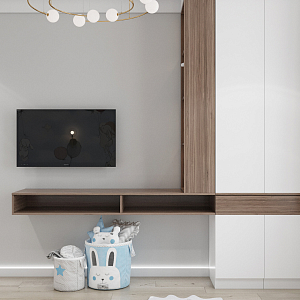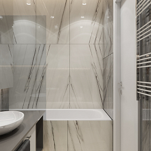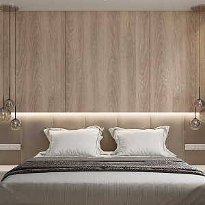 Интерьер спальни с панно за телевизором, стеной с телевизором, телевизором на рейках, телевизором на стене, нишей для телевизора и керамогранитом на стену с телевизором в современном стиле, проект «ЖК Лайф» №6