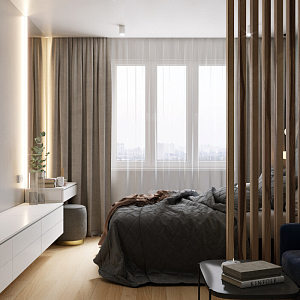 Интерьер гостиной с панно за телевизором, стеной с телевизором, телевизором на рейках, телевизором на стене, нишей для телевизора и керамогранитом на стену с телевизором в современном стиле, проект «Дмитровское шоссе» №19